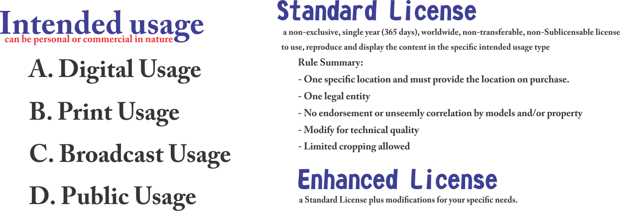 The intended usage can be of a personal or commercial nature, however where the content is used must be provided for before usage and will be subject to the specific terms of each Intended usage type.